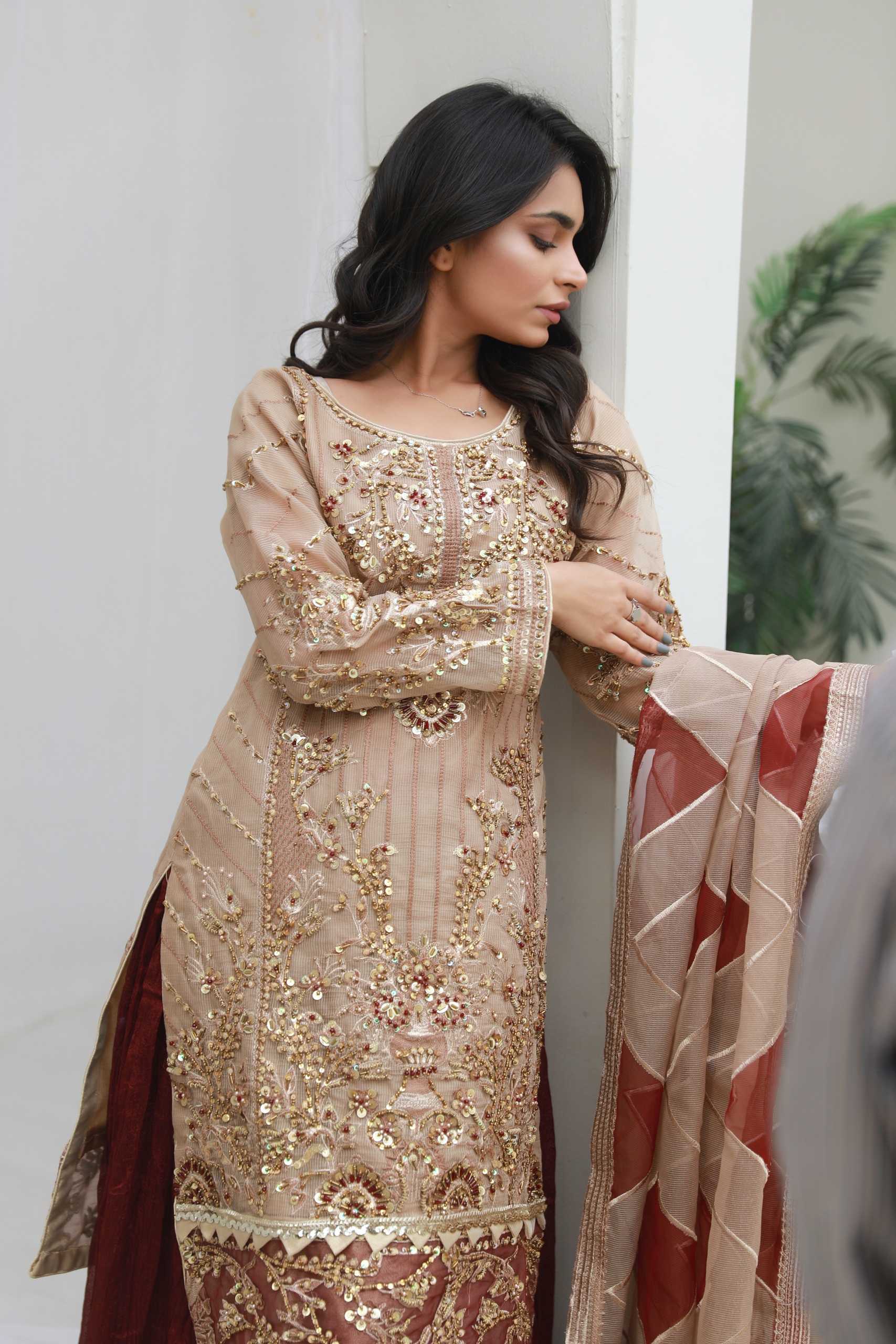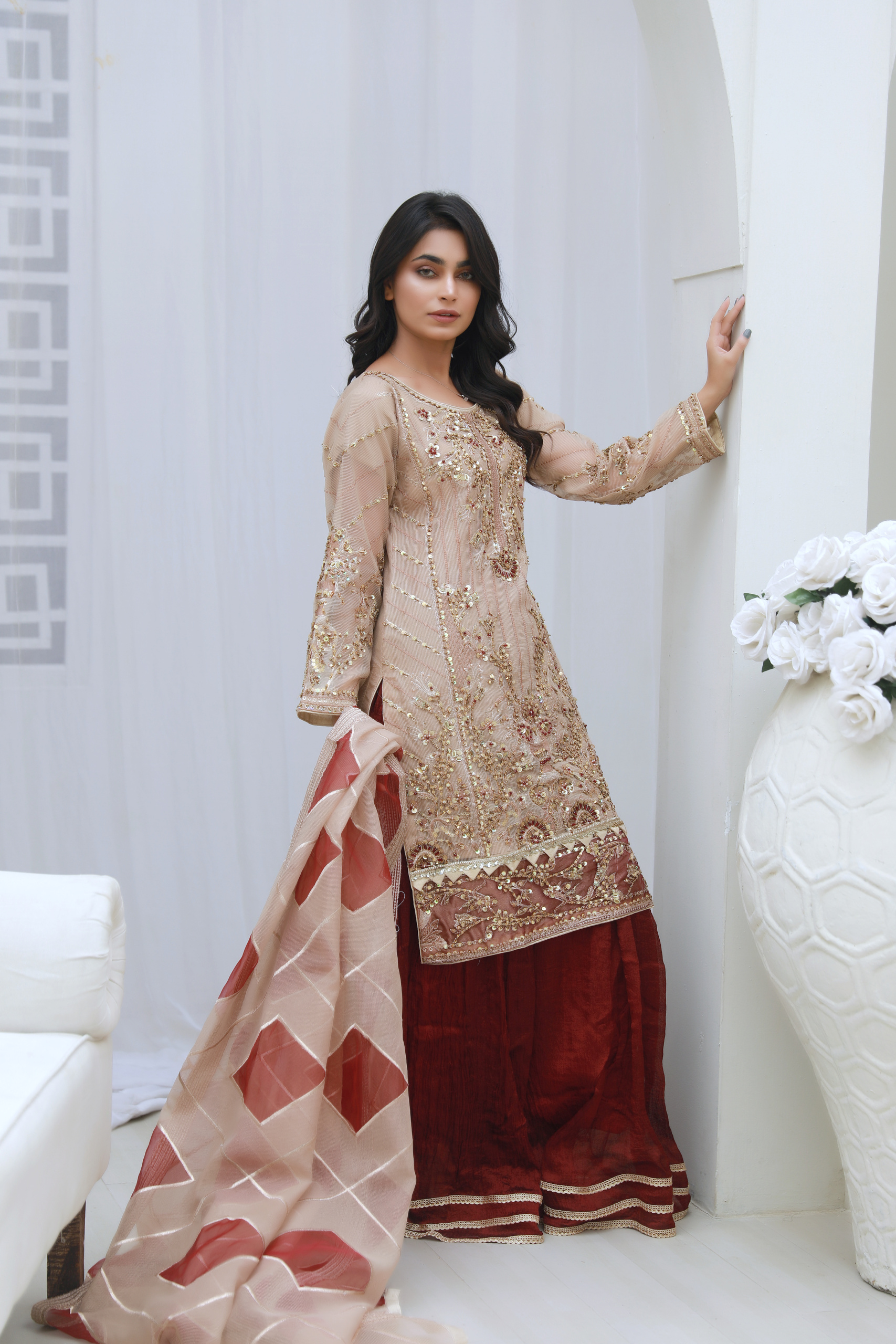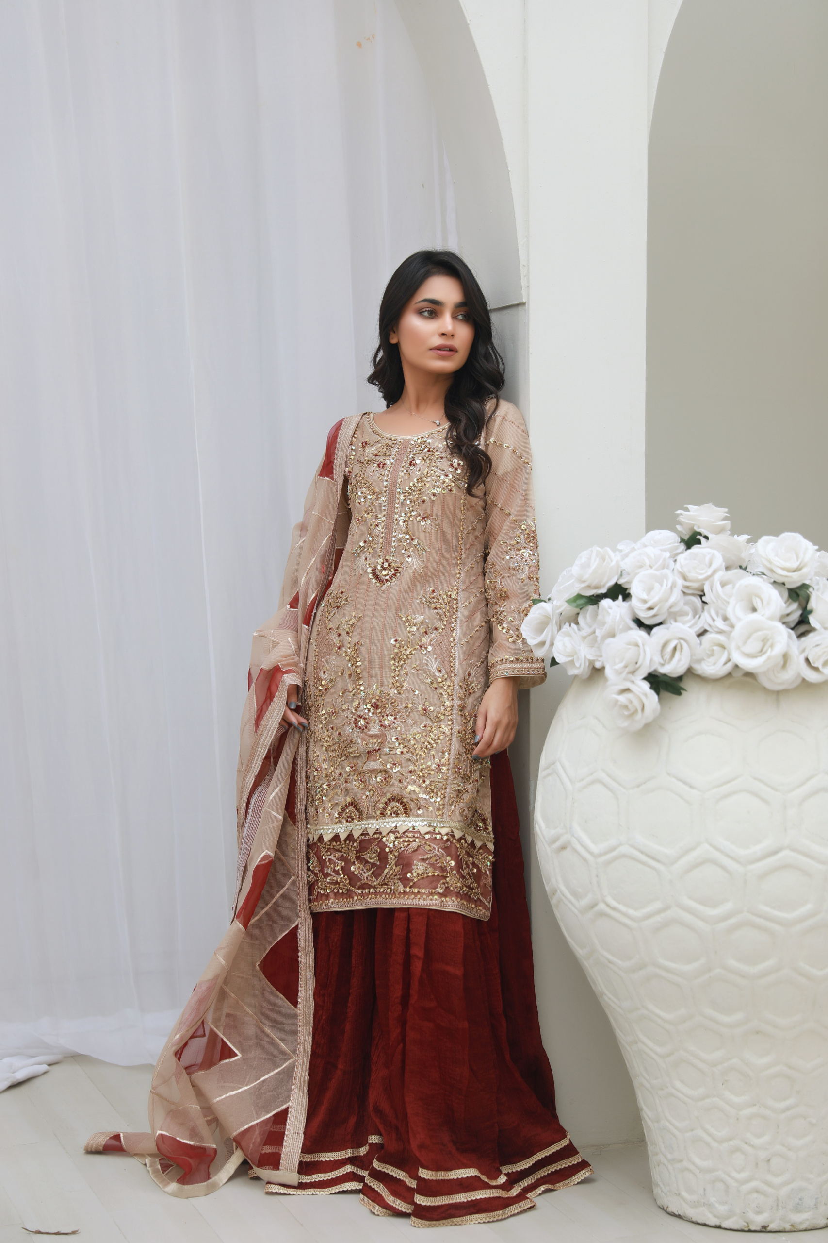 The highlight of this ensemble is the rich maroon sharara, designed with a graceful flare that enhances movement and creates a traditional yet stylish silhouette. Its deep color perfectly contrasts with the soft beige shirt, creating a balanced and eye-catching combination.