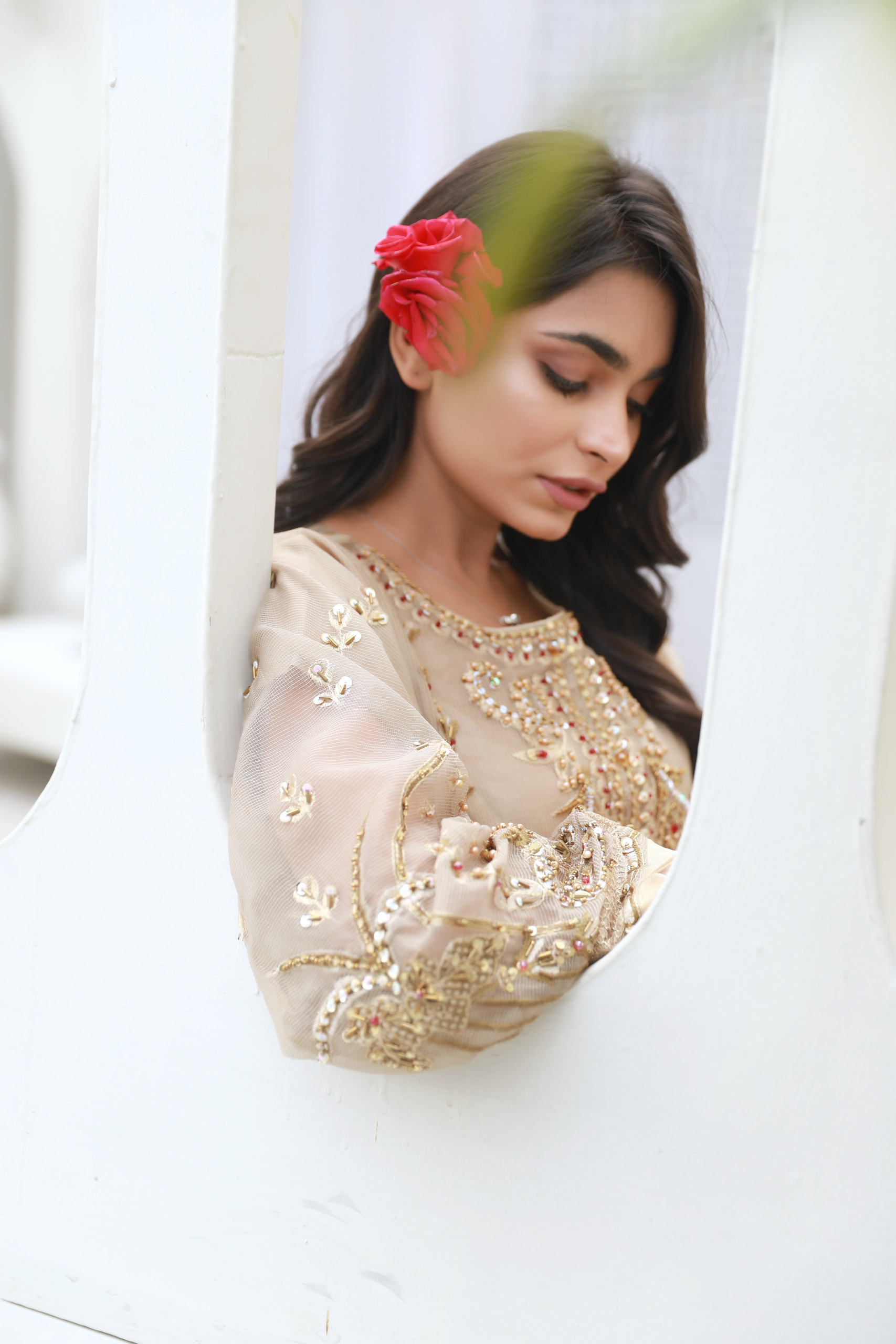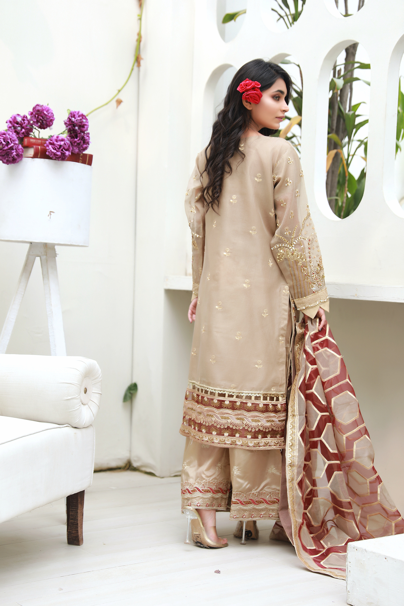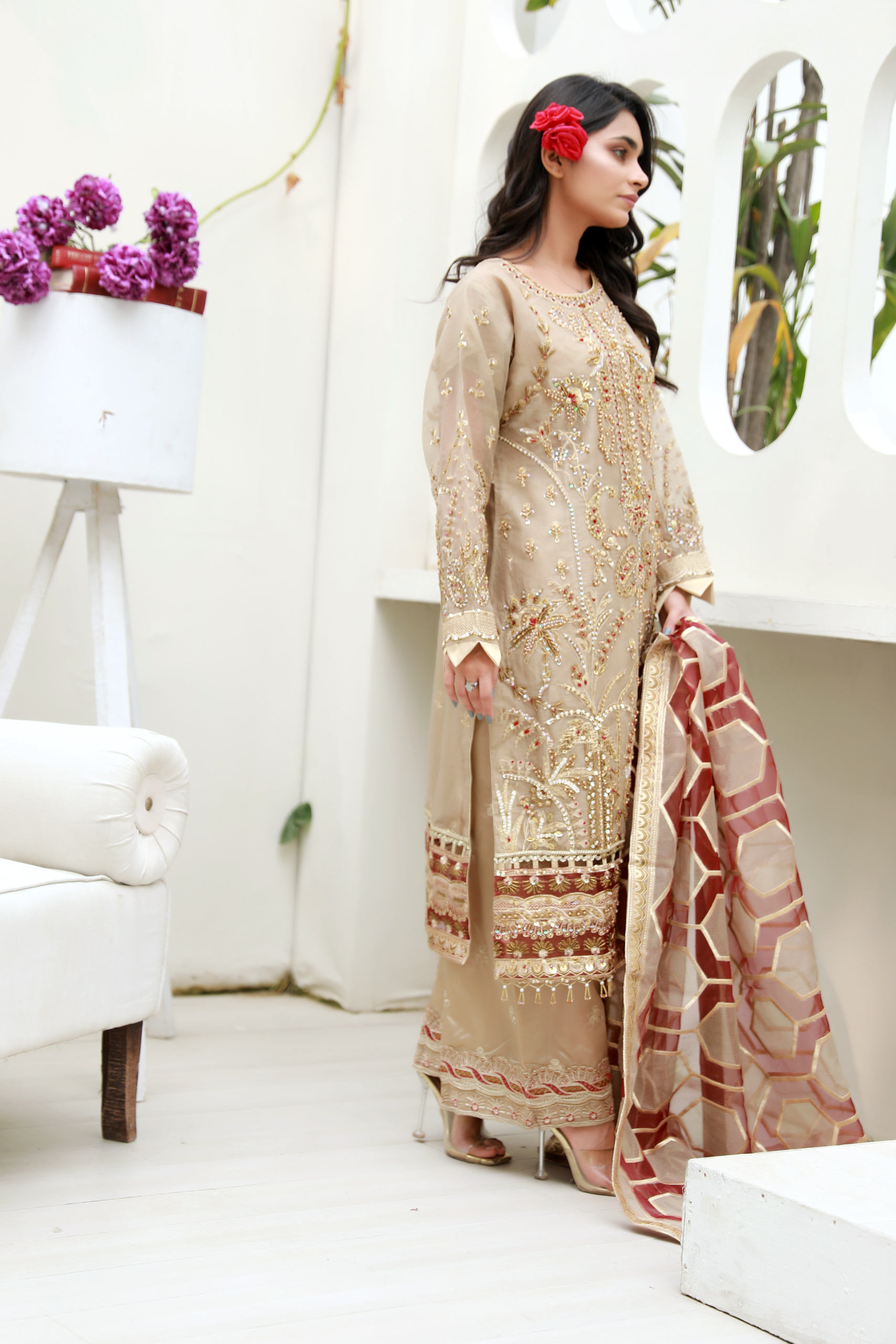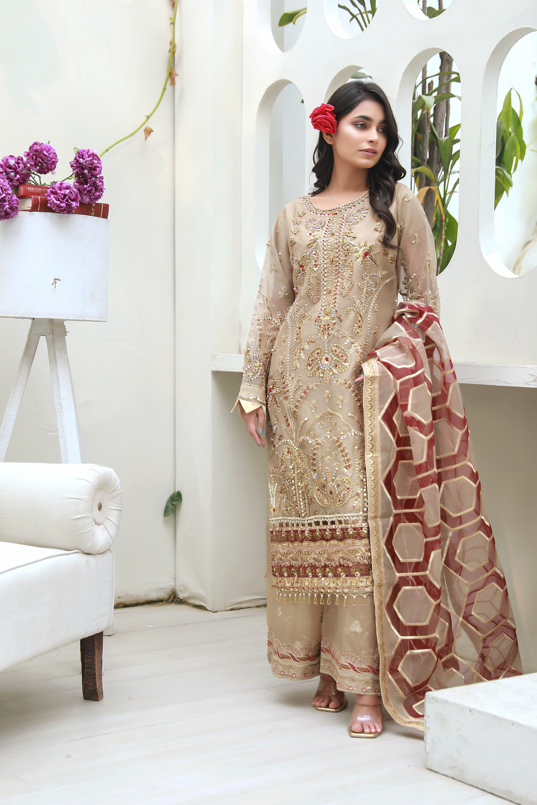A timeless beige formal outfit adorned with intricate gold and maroon embellishments, paired with a statement organza dupatta—perfect for weddings and festive occasions.