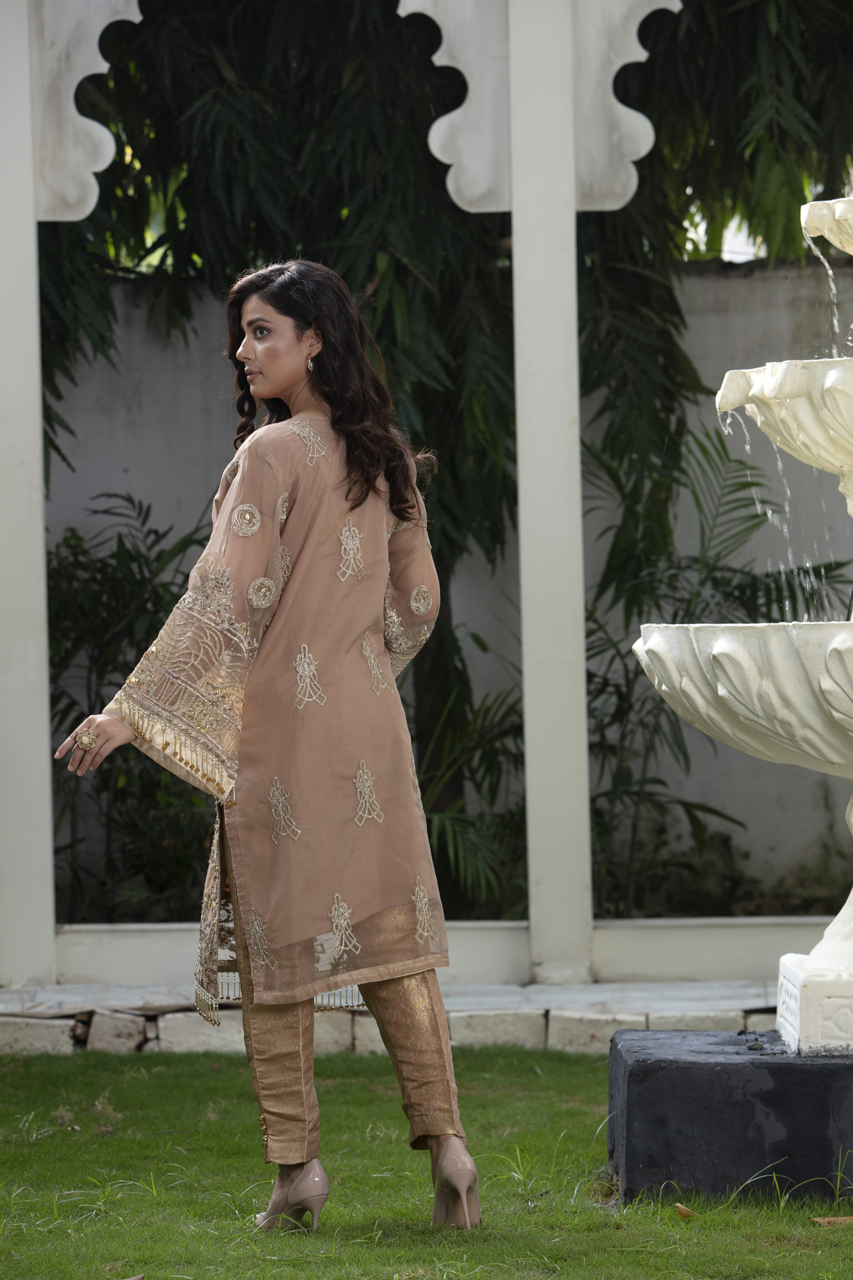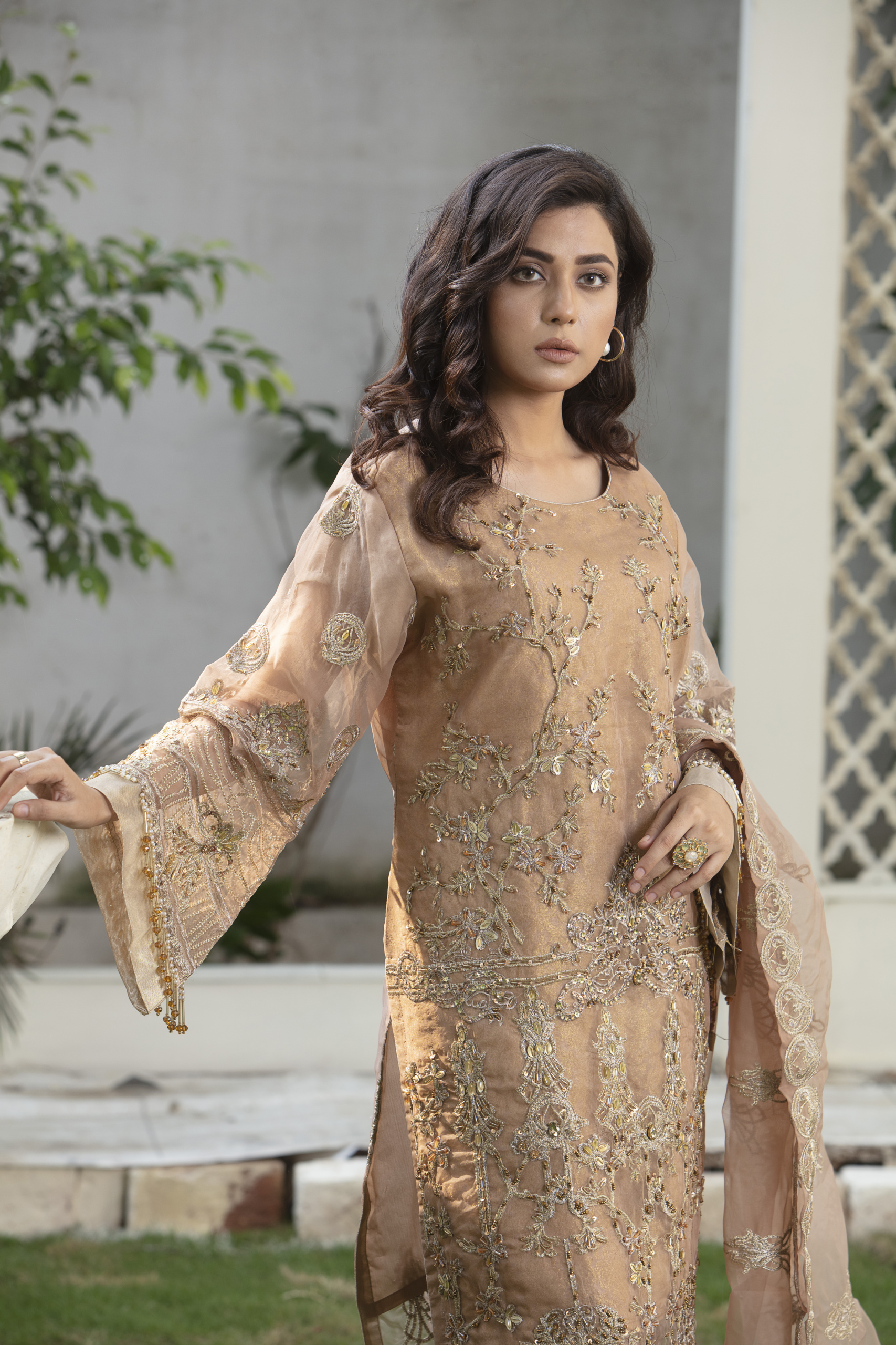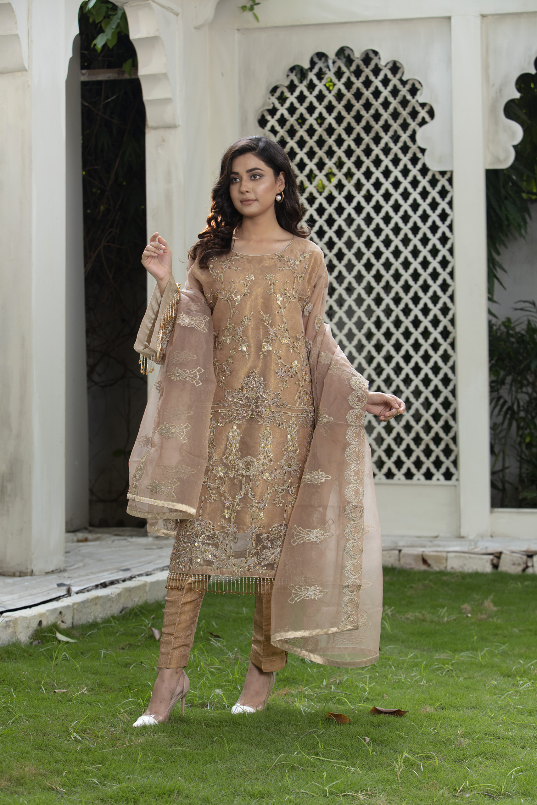Step into timeless elegance with this beautifully crafted peach embroidered suit. Designed with fine attention to detail, this outfit showcases delicate floral embroidery on sheer organza fabric, creating a soft and luxurious look.