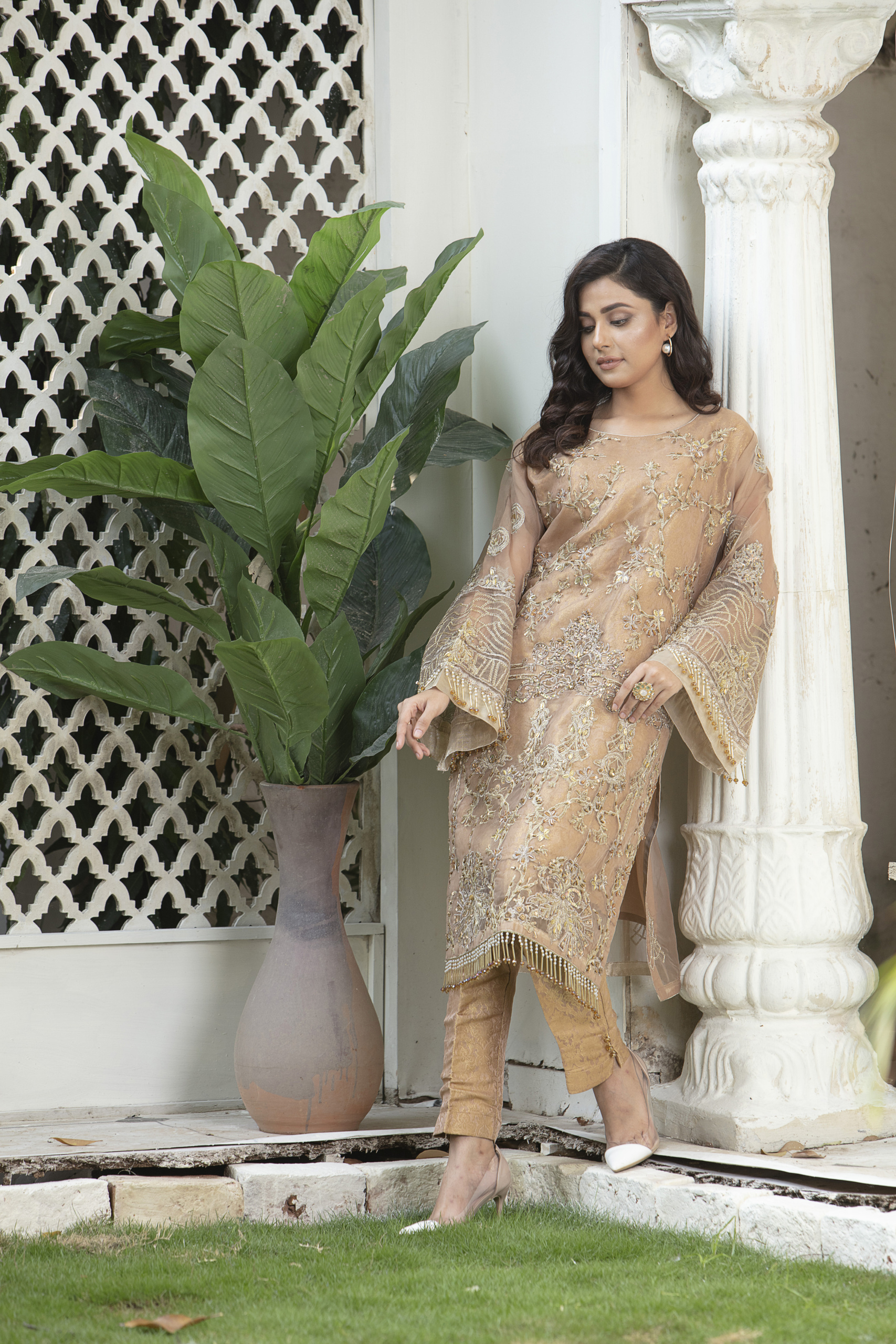Completing the look is a lightweight organza dupatta adorned with elegant embroidery, flowing effortlessly to enhance your overall appearance. This ensemble is ideal for weddings, festive gatherings, and special occasions where you want to stand out with understated elegance.