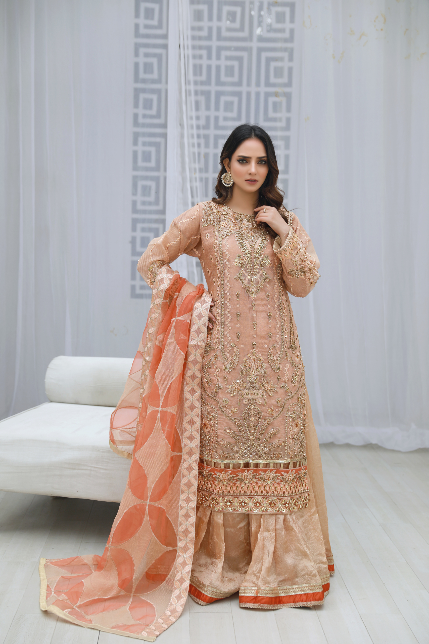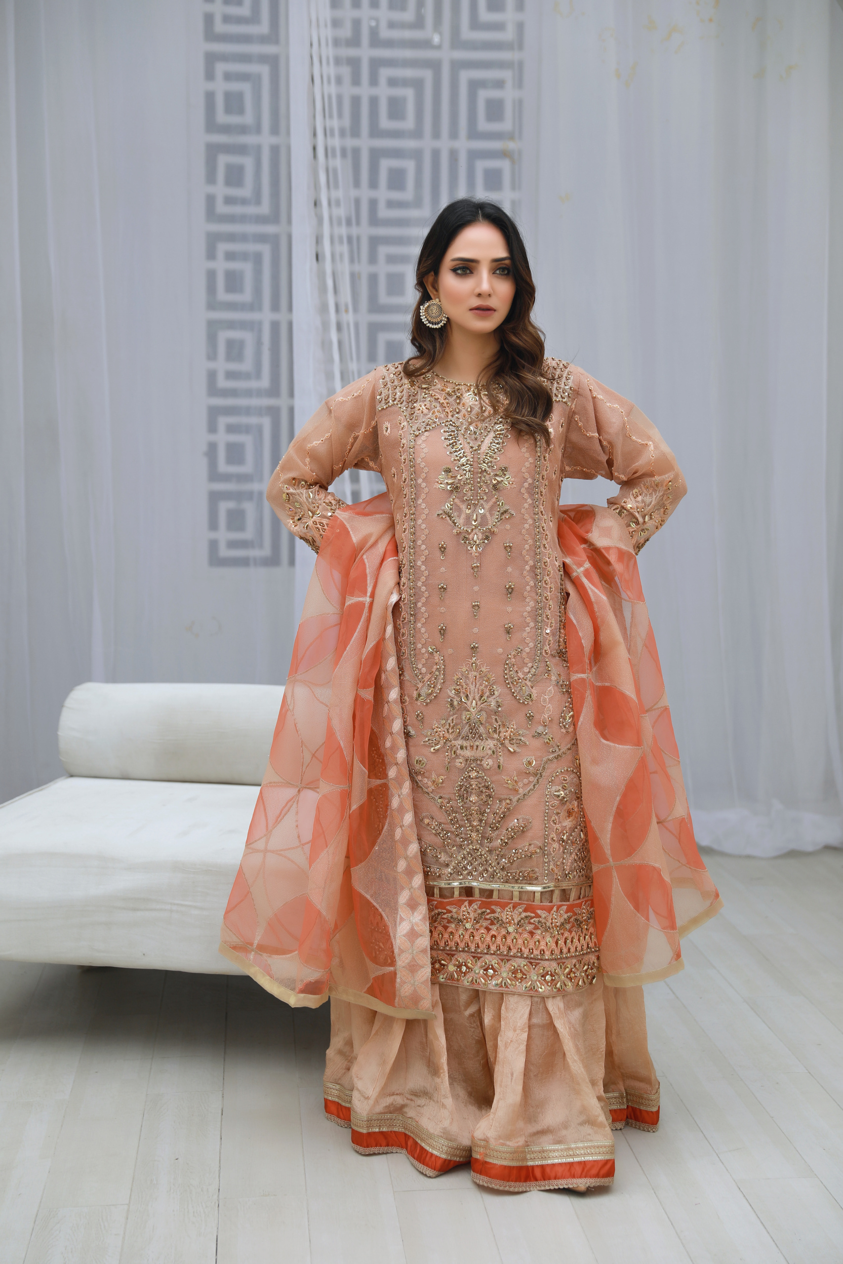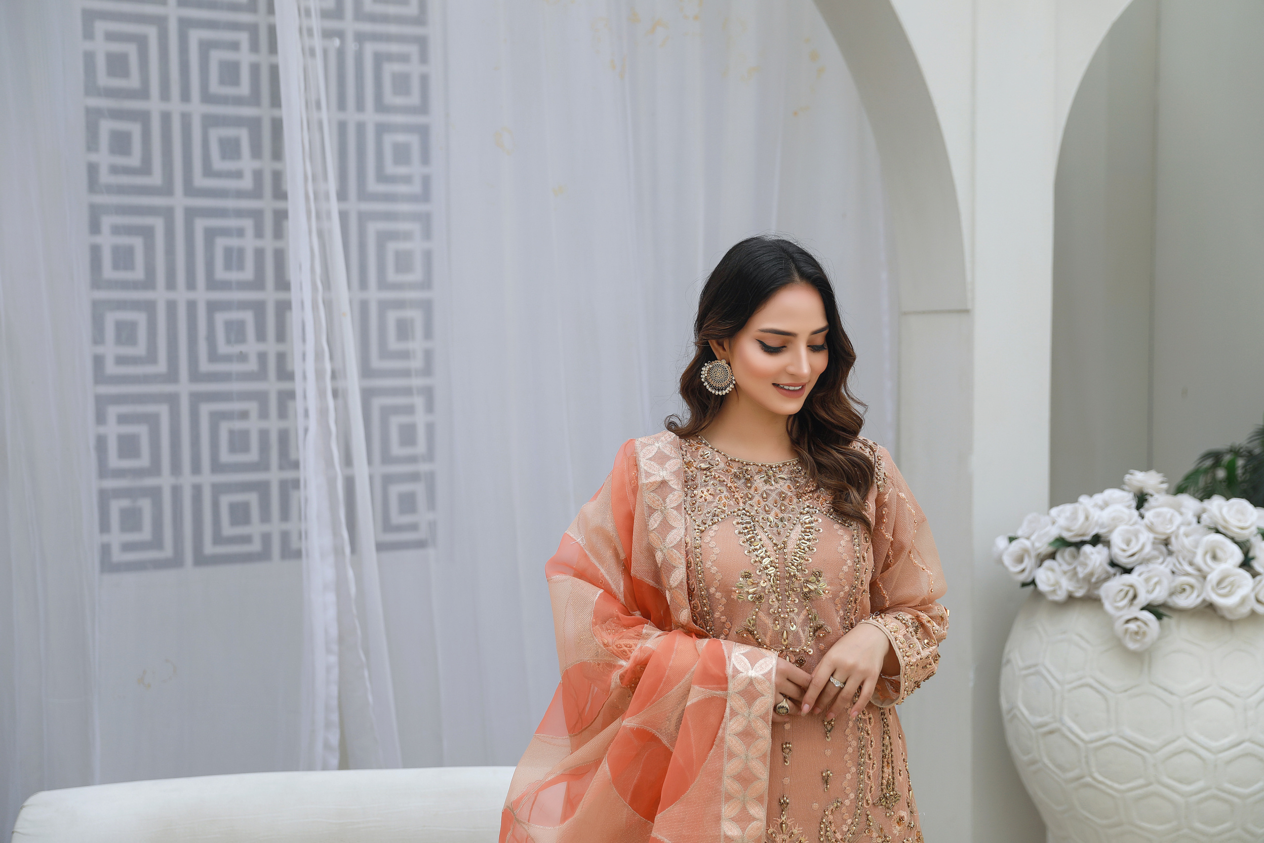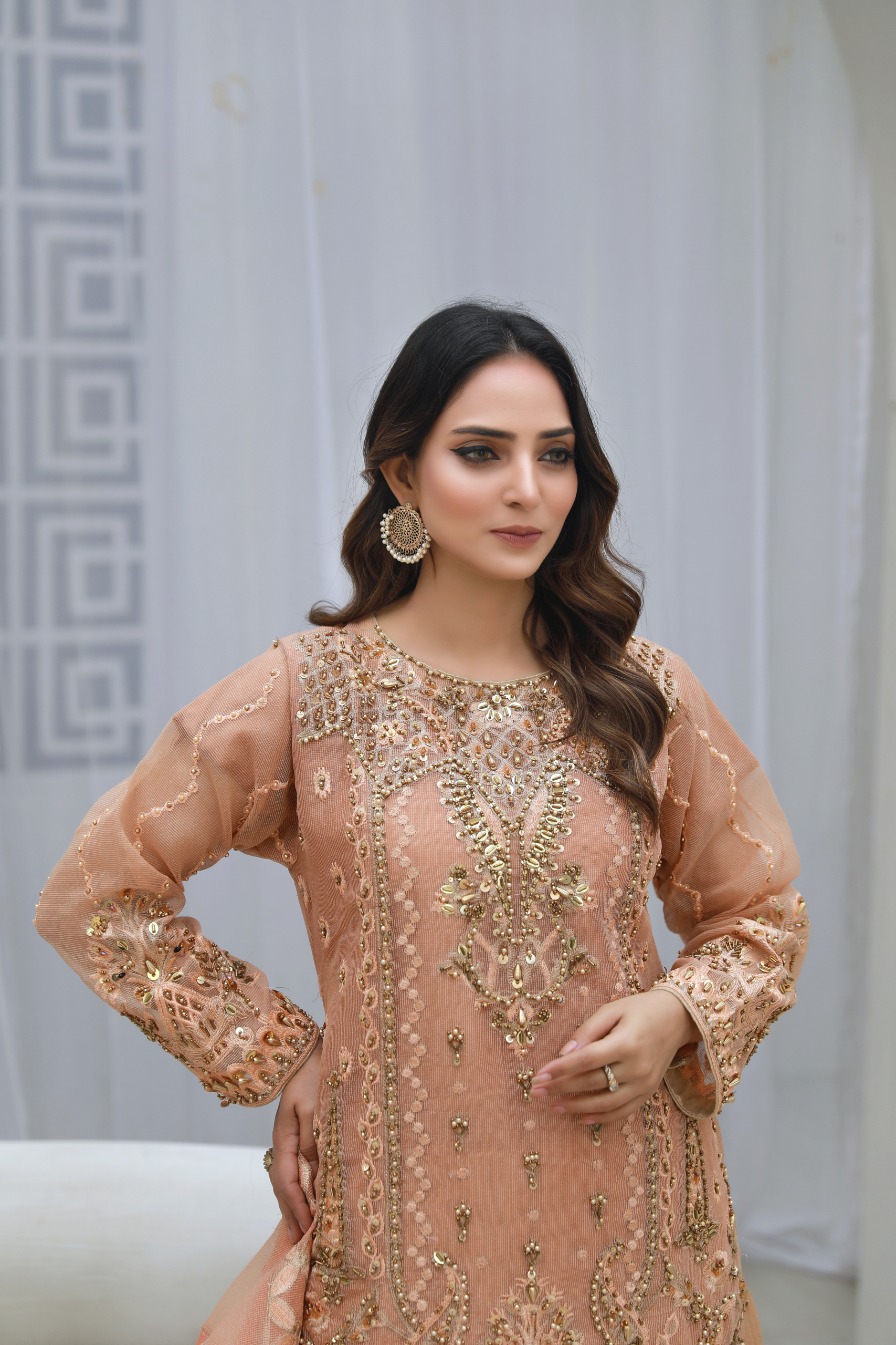 A premium peach formal outfit adorned with intricate hand embellishments, delicate beadwork, and elegant detailing—perfect for weddings and festive occasions.