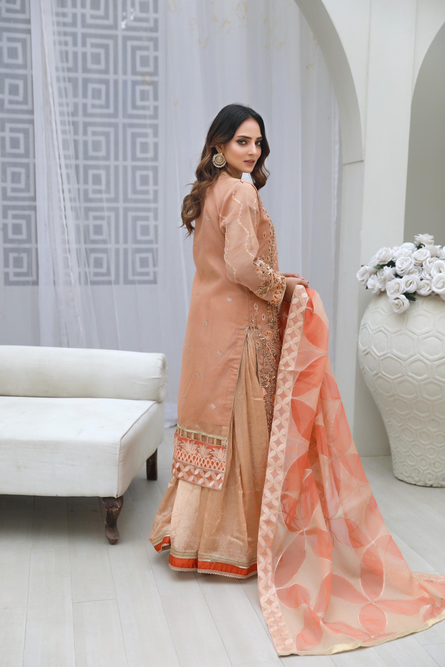 Its soft peach tone offers a graceful and feminine vibe, making it ideal for both daytime and evening events. The ensemble is completed with a matching dupatta and tailored trousers, ensuring a polished and complete look.