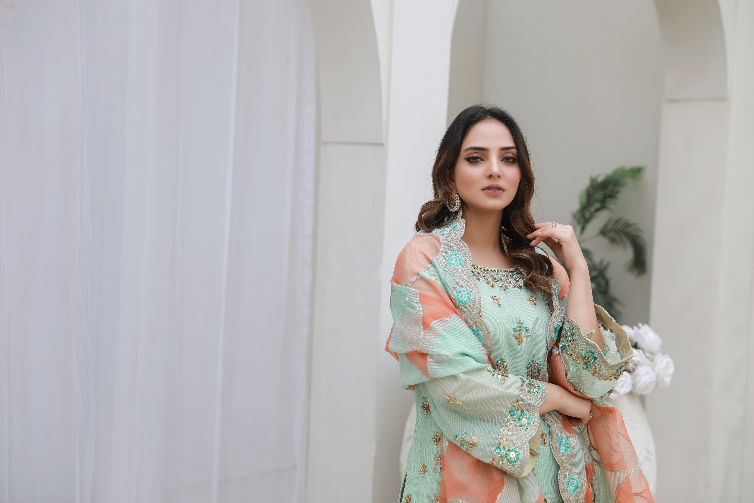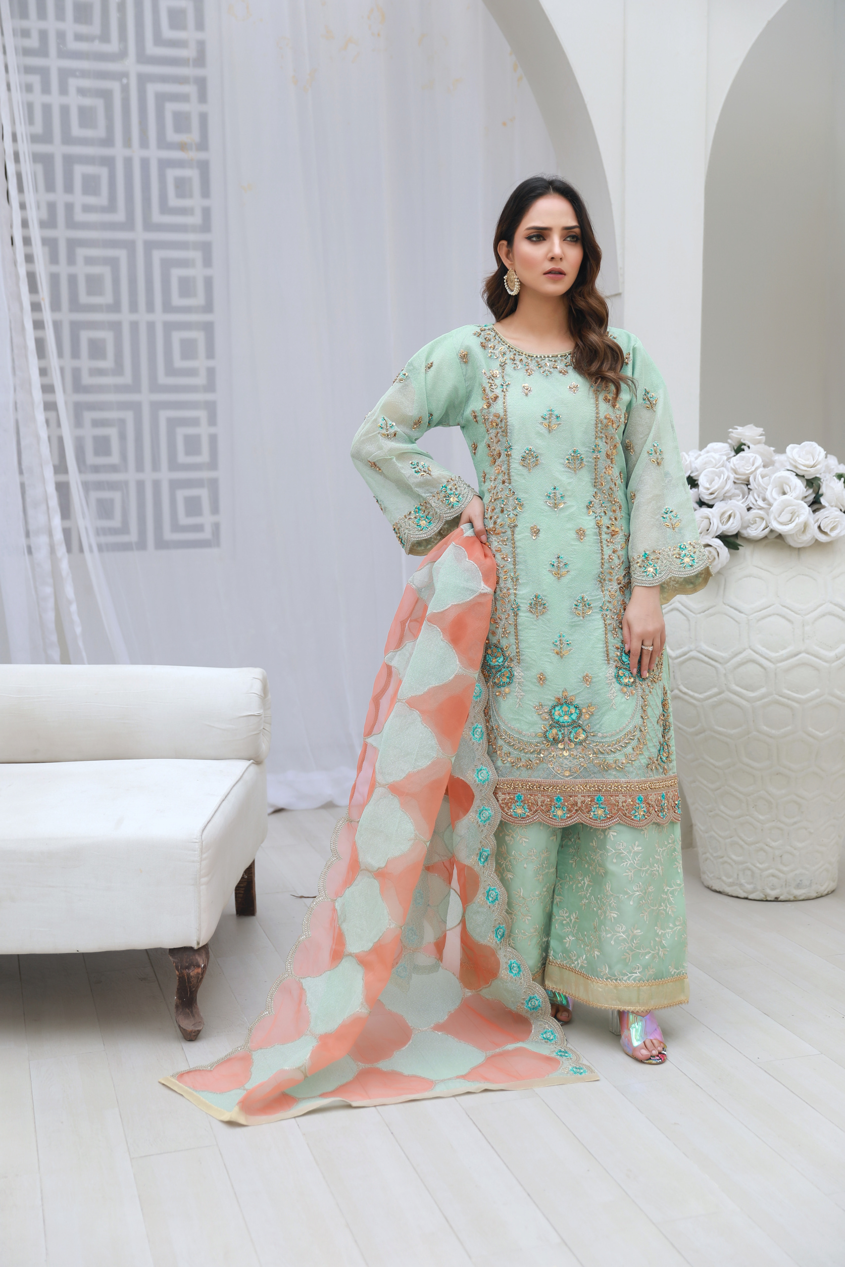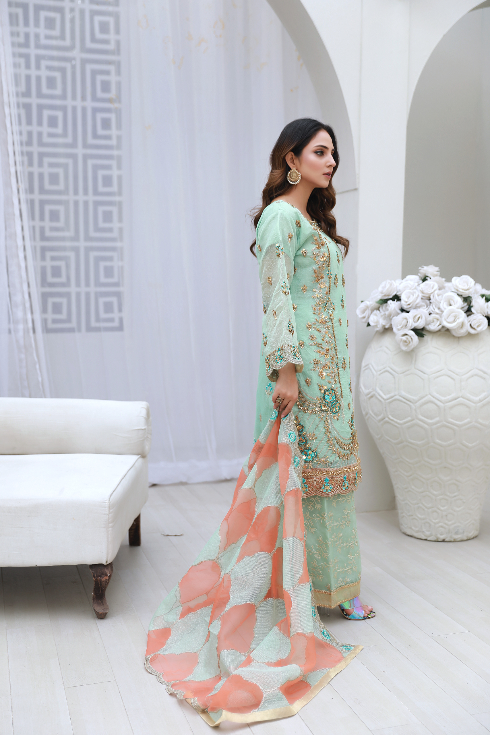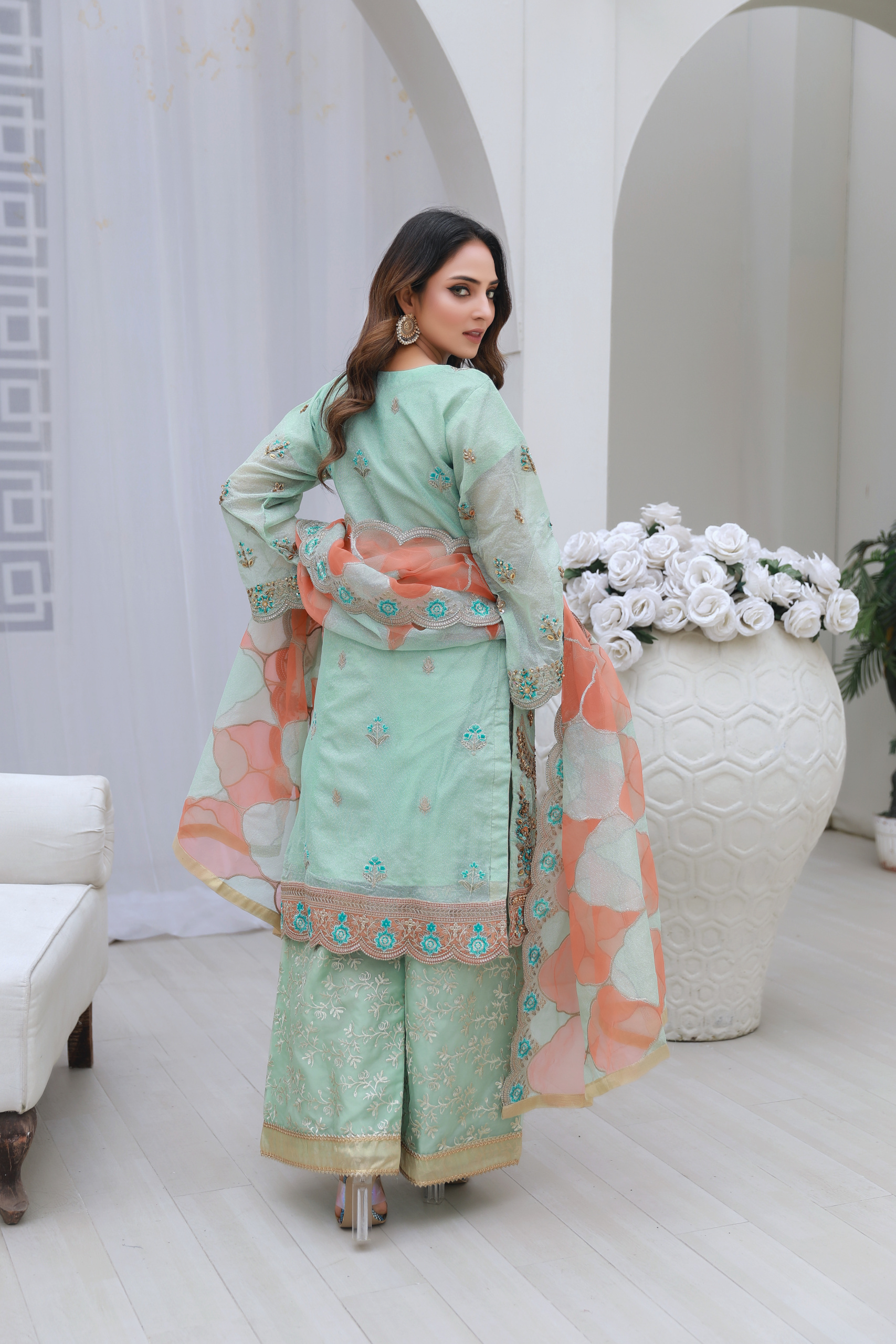 Mint Green & Peach Embroidered Formal Suit with Organza Dupatta
